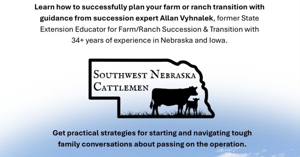 Producers and ag families are invited to the Southwest Nebraska Cattlemen December Meeting at the Nebraska College of Technical Agriculture, featuring farm and ranch succession expert Allan Vyhnalek. The program will be held Thursday, December 4, 2025, from 2–4 p.m. in the NCTA Education Center Auditorium.